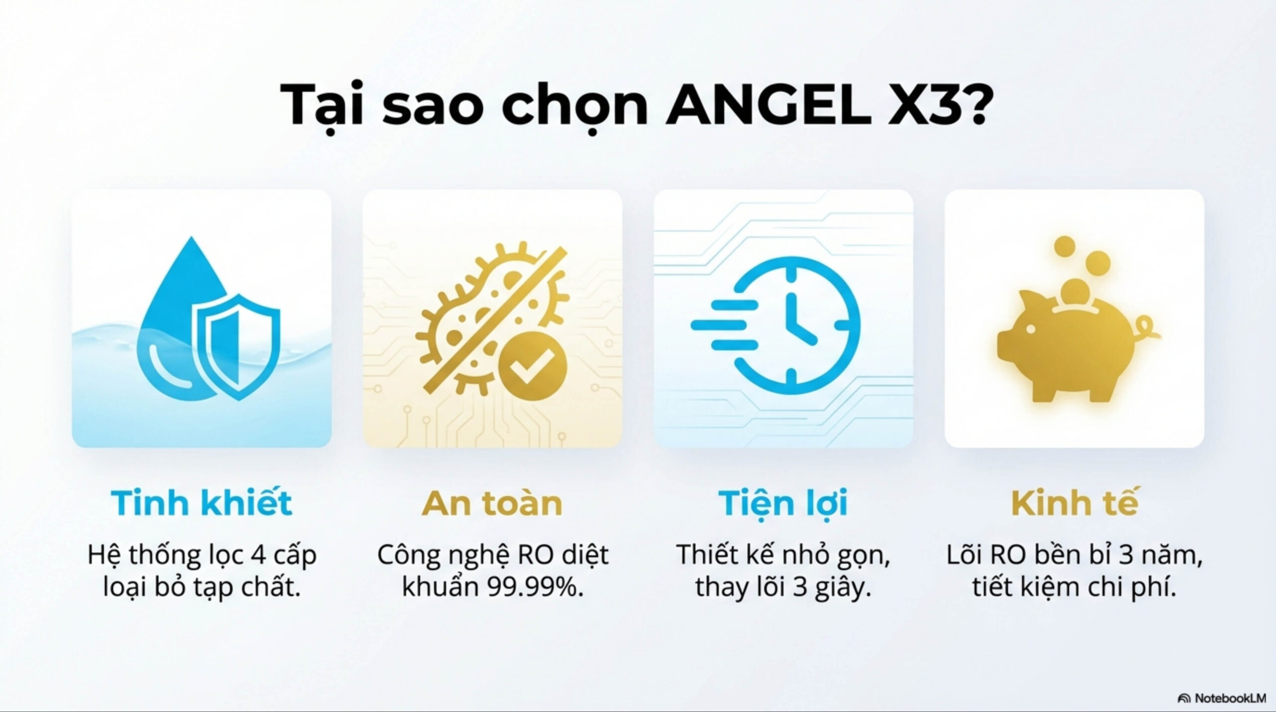 Hoàn toàn an toàn. ANJIER X3 sở hữu công nghệ lọc 4 cấp tiên tiến, loại bỏ hiệu quả kim loại nặng, vi khuẩn và cả dư lượng kháng sinh. Kích thước nhỏ gọn là nhờ sự tối ưu hóa không gian chứ không hề giảm bớt chất lượng lõi lọc.