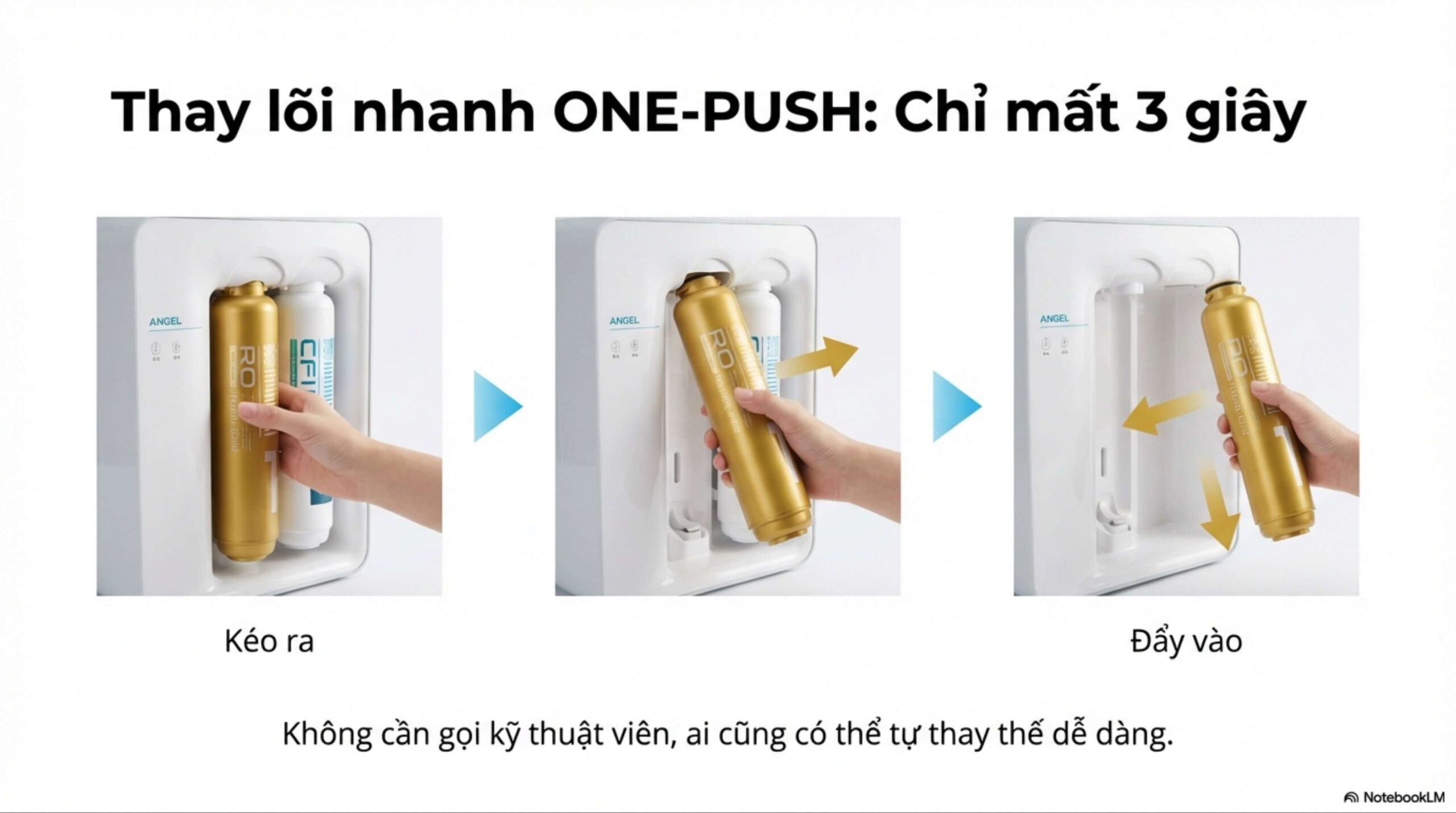 Chỉ cần thao tác kéo – đẩy lõi lọc đơn giản giúp việc thay thế trở nên đơn giản hơn bao giờ hết
